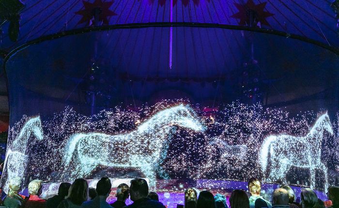 德國龍卡里馬戲團投資50萬歐元打造3D虛擬動物代替活體動物表演,成為世界首個使用全息投影技術的馬戲團,表演也成為世界上最大的燈光秀之一。